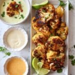 - Serve: Once crispy and cooked through, serve the cauliflower wings with lemon or lime wedges alongside your choice of vegan aioli, cashew queso, or chimichurri sauce.