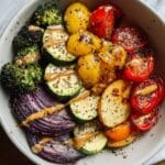 This Amazing Roasted Veggie Rainbow Bowl is a vibrant and flavorful dinner option featuring a colorful medley of roasted bell peppers, zucchini, red onion, cherry tomatoes, and carrots. The vegetables are tender and lightly caramelized, enhanced by a sweet and tangy balsamic-honey drizzle. It’s a nutritious, easy-to-make meal perfect for a healthy, plant-based diet.