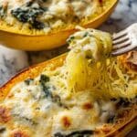 A delicious and creamy Artichoke Stuffed Spaghetti Squash recipe that combines tender roasted spaghetti squash with a rich filling of spinach, artichokes, cream cheese, mayonnaise, and cheeses. This flavorful baked dish is perfect as a comforting vegetarian main or side.