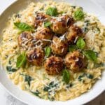 - Serve: Transfer the creamy spinach orzo to a shallow serving bowl. Top with the baked chicken ricotta meatballs, drizzle with a bit of olive oil, and sprinkle extra grated Parmesan cheese for garnish. Serve hot and enjoy!
