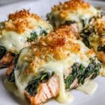 - Assemble in Baking Dish: Grease a baking dish and place salmon skin-side down. Spread the creamy spinach mixture evenly over the salmon. Top with a generous layer of mozzarella cheese.