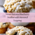 These Banana Blueberry Muffins are moist, fluffy, and bursting with fresh fruit flavor. Topped with a crunchy streusel and a sweet glaze, they make a perfect breakfast treat or snack any time of day.