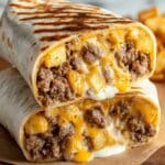 Keywords: beef burrito, cheesy fries burrito, Tex-Mex burrito, cheese sauce, ground beef recipe, easy burrito recipe