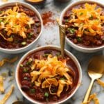 - Serve with toppings: Spoon the chili into bowls and garnish with shredded cheddar cheese, Fritos, and chopped green onions before serving.