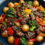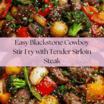 This Blackstone Cowboy Stir Fry is a flavorful and hearty dish featuring tender sirloin steak and a vibrant mix of fresh vegetables cooked on a Blackstone griddle. Marinated in a savory sauce and finished with a thick, tasty stir-fry sauce, this recipe is perfect for a quick, delicious meal served over steamed rice. The combination of soy, oyster sauce, garlic, ginger, and a touch of sweetness creates an authentic and satisfying cowboy-style stir fry.