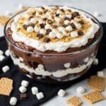 Keywords: brownie dessert, s’mores trifle, layered trifle dessert, chocolate pudding dessert, no bake s’mores, easy dessert recipe