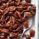 Store candied pecans in an airtight container at room temperature for up to two weeks. To re-crisp, warm them in a 300°F oven for 5 minutes before serving.