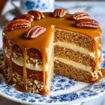A luscious Caramel Pecan Layer Cake featuring spiced moist cake layers studded with chopped pecans, layered and frosted with creamy cream cheese butter frosting, and finished with a rich homemade caramel glaze and whole pecans on top. This cake combines warm cinnamon and nutmeg flavors with sweet caramel, perfect for festive occasions or special desserts.