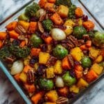 A vibrant and flavorful roasted vegetable medley featuring caramelized butternut squash, carrots, broccoli, and Yukon gold potatoes, enhanced with a tangy cranberry-honey glaze, and topped with creamy feta cheese and crunchy toasted pecans. This dish serves as a comforting vegetarian main or a colorful side, perfect for autumn meals.