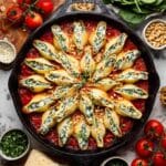 Delicious and comforting baked stuffed jumbo pasta shells filled with a creamy spinach and ricotta cheese mixture, topped with marinara sauce, toasted pine nuts, and fresh basil. This recipe features perfectly cooked conchiglioni pasta shells stuffed with a flavorful blend of cheeses, spinach, and lemon zest, baked until bubbly and golden.