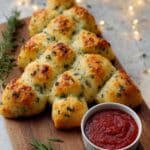 This Easy Cheesy Christmas Tree Bread is a festive appetizer perfect for holiday gatherings. Soft pizza dough filled with a flavorful blend of cream cheese, mozzarella, garlic, and Italian seasoning, baked to golden perfection and shaped into a fun Christmas tree. Serve with marinara or pizza sauce for a delightful dipping experience.