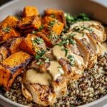 This comforting Chicken & Sweet Potato Bowl combines tender pan-seared chicken breasts marinated in a maple Dijon sauce with oven-roasted sweet potatoes and a base of fluffy quinoa or brown rice. Fresh herbs add brightness to this balanced, wholesome meal perfect for a nourishing lunch or dinner.