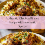 A flavorful and aromatic Chicken Biryani recipe featuring tender marinated chicken cooked with basmati rice and fragrant spices, garnished with fresh cilantro and mint. This classic Indian dish combines marinated chicken, sautéed spices, and perfectly cooked rice for a rich, satisfying meal.