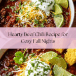 This hearty chili recipe is perfect for cozy fall dinners when you want something warm and satisfying. Packed with ground beef, beans, and a blend of spices, it’s a comforting meal that’s easy to make and sure to please the whole family.