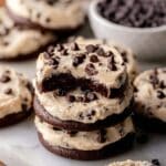 - Assemble Cookie Dough Topping: Using a small cookie scoop (about 1 oz or 1 tablespoon), scoop edible cookie dough balls and place one on top of each cooled chocolate cookie. Gently flatten the cookie dough over the entire surface of each cookie with your hands, creating a generous topping layer.