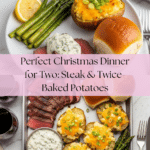 This Christmas Dinner for Two is a perfectly balanced feast featuring juicy rib eye steaks, cheesy twice-baked potatoes, tender asparagus, and warm rolls. It’s an elegant yet approachable meal that’s sure to impress without spending all day in the kitchen.