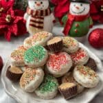 - Decorate the cookies: Quickly press half of a miniature Reese’s peanut butter cup on top of each coated cookie to adhere while the almond bark is still wet. Sprinkle with colored sanding sugars or decorate further with desired candies.