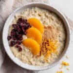 A warm and comforting Cinnamon Orange Quinoa recipe that combines fluffy quinoa cooked in vanilla plant-based milk with citrusy orange juice and zest, aromatic cinnamon and nutmeg, and a touch of sweetness from sugar and dried cherries. Perfect for a nutritious breakfast or a wholesome snack.