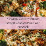 This Cowboy Butter Lemon Bowtie Chicken with Broccoli is a flavorful and creamy pasta dish combining tender Cajun-seasoned chicken, bright lemon butter sauce, fresh herbs, and nutritious broccoli florets. The bowtie pasta is cooked al dente and tossed in a rich, garlicky butter sauce with parmesan cheese, making it a comforting yet vibrant main course perfect for weeknight dinners or entertaining.