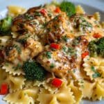 This Cowboy Butter Lemon Bowtie Chicken with Broccoli is a flavorful and creamy pasta dish combining tender Cajun-seasoned chicken, bright lemon butter sauce, fresh herbs, and nutritious broccoli florets. The bowtie pasta is cooked al dente and tossed in a rich, garlicky butter sauce with parmesan cheese, making it a comforting yet vibrant main course perfect for weeknight dinners or entertaining.