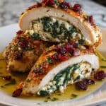 This Cranberry & Spinach Stuffed Chicken Breasts recipe features tender boneless, skinless chicken breasts stuffed with a flavorful mixture of fresh spinach, dried cranberries, and creamy goat cheese. The chicken is first seared to develop a golden crust, then baked to juicy perfection. A perfect balance of savory, tangy, and slightly sweet flavors makes this dish an elegant yet simple option for a nutritious dinner.