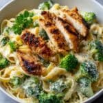 Creamy Garlic Chicken Alfredo with Broccoli & Fettuccine is a comforting, flavorful dish that combines tender chicken, fresh broccoli, and rich Alfredo sauce with perfectly cooked pasta. It’s a quick and satisfying meal that’s perfect for weeknight dinners or special occasions.