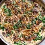 - Combine Ingredients: Add the reserved caramelized onions back into the skillet, stirring them into the creamy mushroom and spinach sauce.