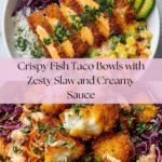 Keywords: fish taco bowl, crispy fish, taco night, easy dinner, Mexican-inspired, gluten-free fish tacos, creamy chipotle sauce, zesty slaw, pan-fried fish