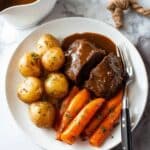 - Serve: Season the cooked carrots and potatoes with salt and pepper if desired and serve alongside the tender roast and rich gravy.