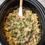 - Serve with noodles and garnish: Stir in the cooked egg noodles until combined. Garnish with fresh parsley if desired, serve warm, and enjoy your comforting crockpot beef stroganoff.