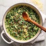 This Easy Creamed Spinach recipe is a rich and creamy side dish made with frozen chopped spinach, butter, garlic, and Parmesan cheese. It’s a simple, comforting accompaniment to any meal that’s ready in under 30 minutes, perfect for adding a flavorful green vegetable to your plate.