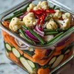 This Easy Refrigerator Pickled Vegetables recipe offers a crunchy and tangy mix of cauliflower, carrots, cucumbers, red bell pepper, and green beans pickled in a flavorful vinegar brine with garlic, mustard seeds, peppercorns, and a touch of spice. Perfect for a quick, no-canning way to enjoy homemade pickles that can be prepared in under an hour and stored fresh in the fridge.