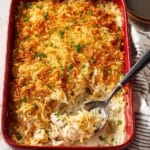 Firefighters Chicken Spaghetti is a creamy, cheesy baked pasta casserole featuring tender cooked chicken, spaghetti noodles, and a rich blend of cream of chicken and mushroom soups. Enhanced with celery, onions, and a crunchy cornflake topping, this comforting dish is perfect for a hearty family meal.