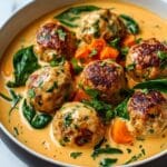 Golden Chicken Meatballs in a rich and creamy paprika sauce, served with tender baby spinach and sweet roasted pumpkin. This comforting dish combines succulent meatballs pan-seared to perfection and simmered in a luscious sauce made with heavy cream, chicken stock, and cream cheese, topped with crispy shallots, toasted dukkah, and fresh parsley for added texture and flavor.