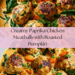 Keywords: Chicken meatballs, Creamy paprika sauce, Roasted pumpkin, Spinach, Comfort food, Easy dinner
