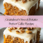 Grandma’s Famous Sweet Potato Butter Cake is a moist, spiced cake that combines the natural sweetness of mashed sweet potatoes with the richness of butter and a touch of cinnamon and nutmeg. Topped with an optional luscious vanilla glaze, this classic dessert is perfect for cozy family gatherings and year-round celebrations.