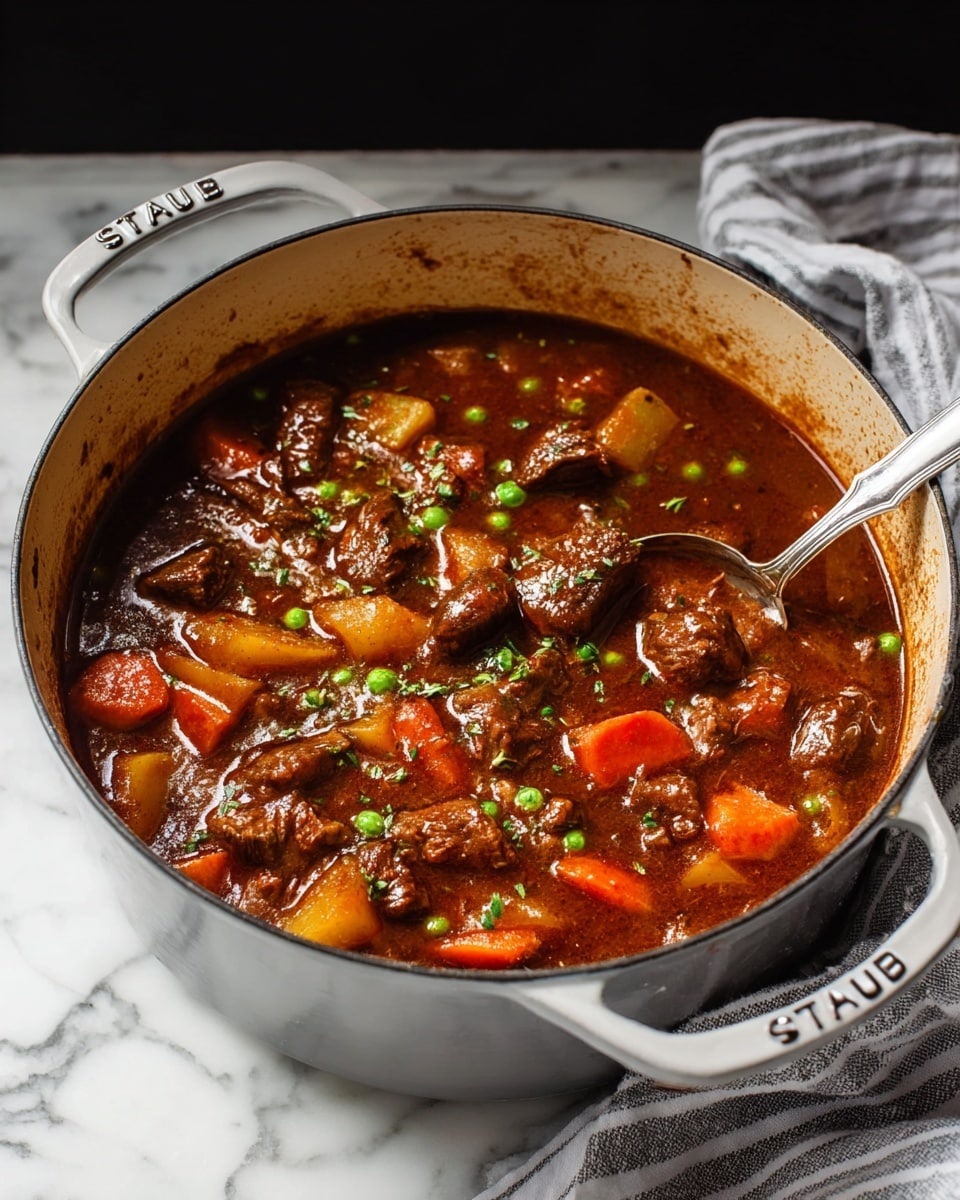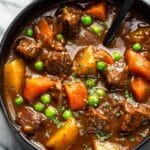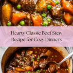 This hearty Beef Stew recipe features tender chunks of seared beef simmered slowly with aromatic vegetables, red wine, and rich beef broth. Enhanced with tomato paste, Worcestershire sauce, and Italian seasoning, the stew is finished with tender potatoes, carrots, and optional peas, creating a comforting and flavorful meal perfect for cozy dinners.