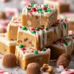 Keywords: holiday fudge, peanut butter fudge, Christmas dessert, no bake fudge, white chocolate fudge, festive treats