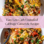 This Low Carb Unstuffed Cabbage Casserole is a comforting and flavorful dish that brings all the taste of traditional stuffed cabbage without the fuss of rolling. Packed with ground beef, fire-roasted tomatoes, and tender cabbage, it’s a delicious, easy meal perfect for any night of the week.
