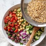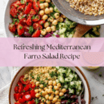 A refreshing and hearty Mediterranean Farro Salad featuring cooked farro tossed with fresh vegetables, kalamata olives, chickpeas, and a tangy homemade dressing. Perfect as a nutritious lunch or side dish, this salad combines wholesome grains with vibrant Mediterranean flavors for a satisfying and healthy meal.