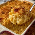 Melissa Jo’s Baked Macaroni & Cheese is a rich, creamy, and cheesy comfort food classic, featuring a blend of cheddar, mozzarella, Gruyere, and Velveeta cheeses combined into a velvety sauce. The pasta is cooked just under al dente and baked with a buttery seasoned panko breadcrumb topping, creating a perfect balance of creamy interior and a golden, crispy crust.