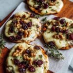- Add Toppings: Layer the Brie cheese slices evenly on each crust, then sprinkle dried cranberries and chopped toasted walnuts over the top for texture and flavor.