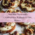 These mini pizzas combine the creamy richness of Brie cheese with the tartness of dried cranberries and the crunch of toasted walnuts, all enhanced by a sweet and spicy hot honey drizzle. Perfect as an elegant appetizer or a quick snack, these bite-sized pizzas are easy to prepare and baked to golden perfection for a delightful balance of flavors and textures.