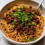 Mongolian Ground Beef Noodles is a savory and slightly sweet stir-fry dish featuring tender ground beef cooked with garlic, brown sugar, soy sauce, hoisin sauce, and aromatic spices, served over linguine noodles and garnished with fresh green onions. This quick and easy recipe brings bold Asian-inspired flavors to your dinner table in under 30 minutes.