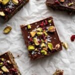 - Cover and Garnish: Pour the melted chocolate evenly over the pressed brownie mixture by tilting the pan. Garnish the top with chopped pistachios, dried cranberries, chopped pecans, and a light sprinkle of Maldon sea salt.