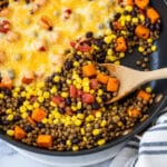 Keywords: Mexican lentils, one pot meal, vegetarian lentils, healthy lentil recipe, Mexican cooking, sweet potatoes, black beans, easy dinner