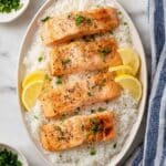- Serve: Transfer the cooked salmon fillets to a serving platter. Squeeze fresh lemon juice over the top and scatter chopped parsley for an aromatic and fresh garnish before serving.