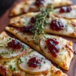 Keywords: flatbread, Brie cheese, pear, cranberry sauce, thyme, appetizer, baking, easy recipe, snack