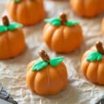 - Add Pumpkin Details: Immediately stick a small pretzel piece into the top of each ball to represent the pumpkin stem, and add leaf-shaped icing decorations next to the stems.