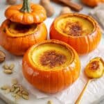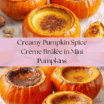 This Pumpkin Spice Crème Brûlée is a cozy twist on a classic French dessert, perfect for fall gatherings. Baked inside small hollowed pumpkins, it combines warm spices with creamy custard and a crisp caramelized sugar topping.
